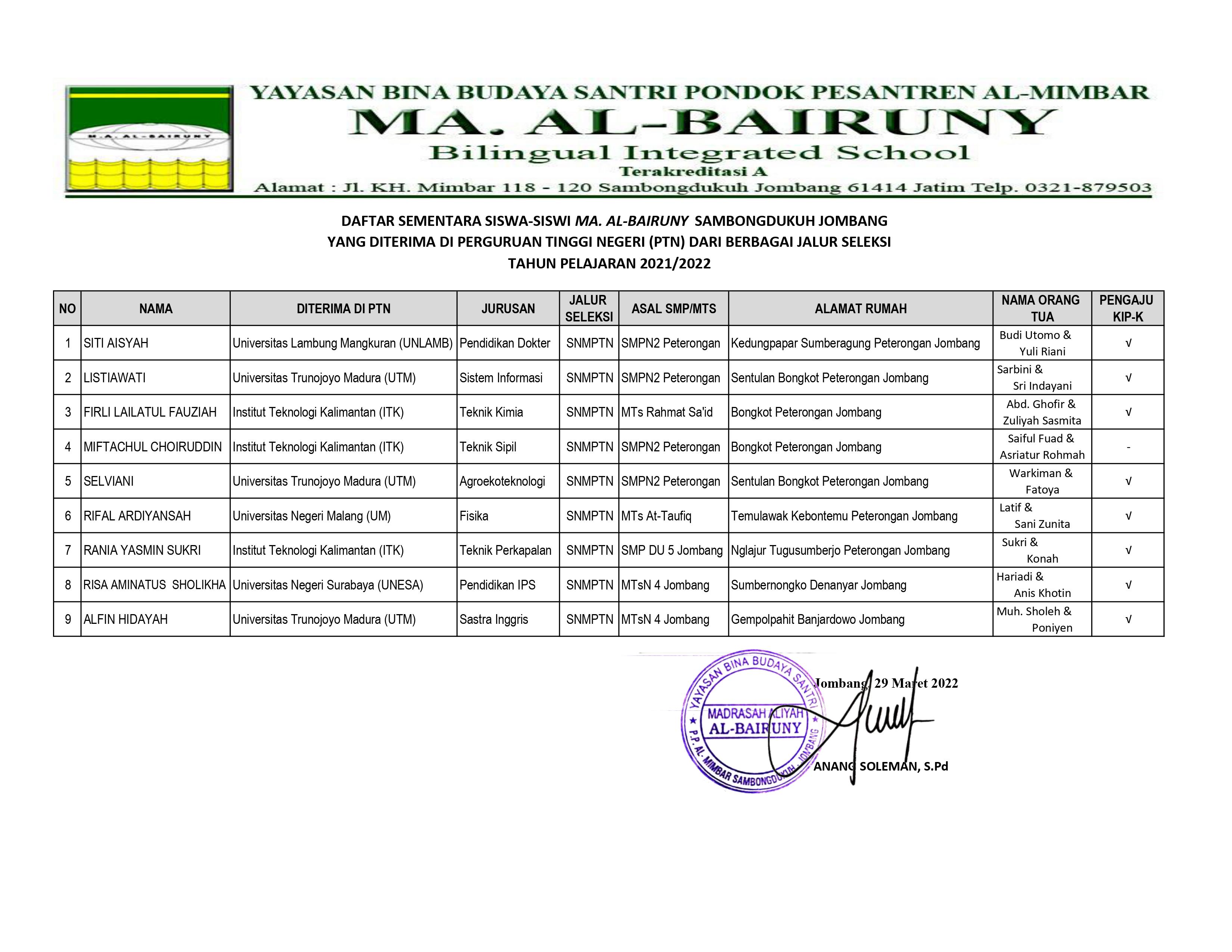 Khususnya Madrasah Aliyah AL-BAIRUNY Jombang, Setelah melewati beberapa tahapan antara lain seperti proses perenkingan nilai siswa yang eligible, pendaftaran KIP-kuliah dan proses pendaftaran Seleksi Nasional Masuk Perguruan Tinggi Negeri (SNMPTN) Tahun 2022 yang mulai dibuka pada Senin 14 Februari 2022 hingga 28 Februari 2022 lalu.